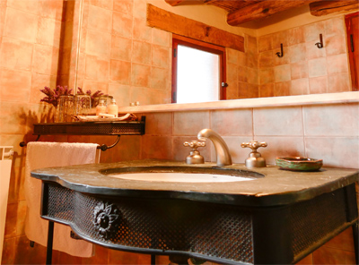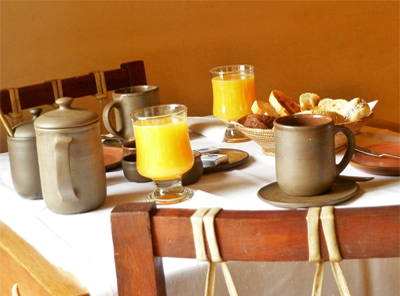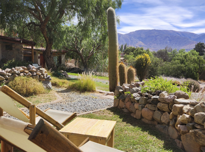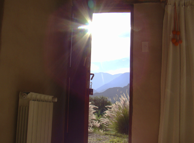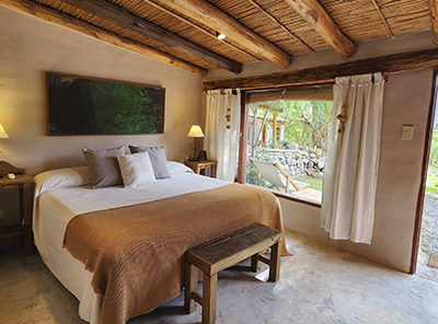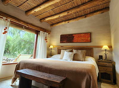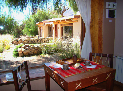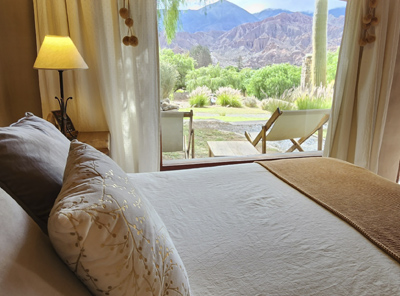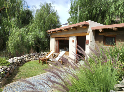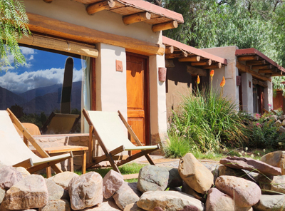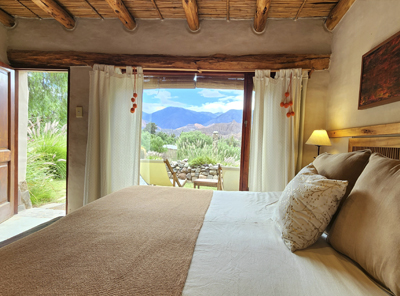 La arquitectura típica de la zona, paredes de adobe con techos de caña y barro integran las cuatro habitaciones que miran desde lo alto a la Quebrada de Humahuaca y al pueblo de Tilcara, donde el turquesa profundo del cielo y los matices de los cerros envuelven al huésped haciéndolo parte del lugar desde un ambiente cálido que invita al encuentro y al descanso.
